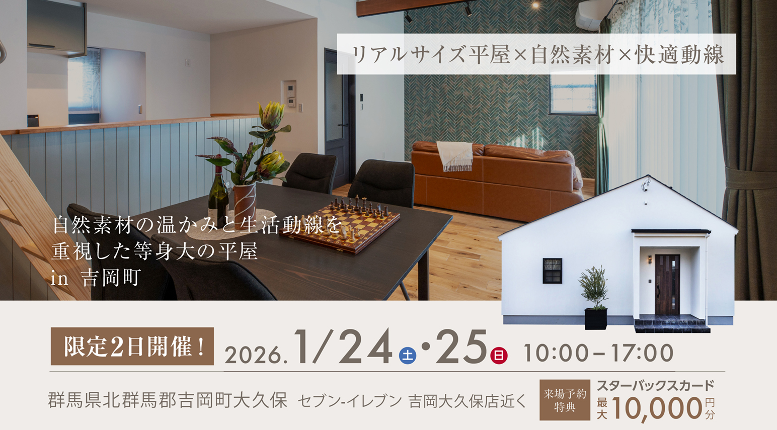 是非ご来場いただき、当社こだわりの【リアルサイズ平屋×自然素材×快適動線】をご体感ください。