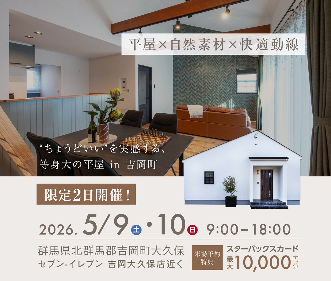 是非ご来場いただき、当社こだわりの【自然素材×快適動線】の平屋をご体感ください。