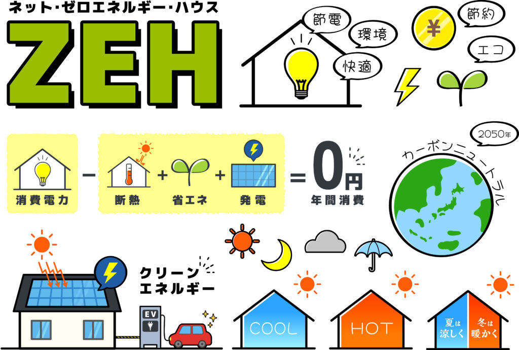 そもそもZEHとは「ネット・ゼロ・エネルギー・ハウス(Net Zero Energy House)」の略で、住宅で消費する年間の一次エネルギー消費量を、断熱性能の向上や高効率な設備機器の導入により大幅に削減し、さらに太陽光発電などの再生可能エネルギーを活用することで、消費するエネルギー量の100%以上を自家発電でまかなう住宅のことを指します。